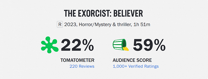不过《驱魔人:信徒》的口碑堪忧,烂番茄新鲜度低至22%,影评人认为其试图回归系列起点的努力值得肯定,但“缺乏新的想法和恐怖元素”,作为计划中的新三部曲开篇并非吉兆;而《驱魔人:信徒》的爆米花指数同样只有59%,可见观众对这部最新作也不买账。叠加IMDb上的5.1分(6.6千个评价),《驱魔人:信徒》的续航力不容乐观。