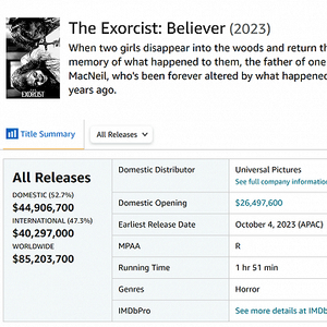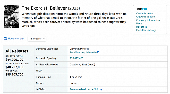 这一成绩显著高于19年前的《驱魔人前传》(1805万美元),在该系列的重启作品中占据先机。但在今年亮相的恐怖片中,《驱魔人:信徒》的表现难言突出,排在《惊声尖叫6》、《潜伏5:红门》、《修女2》和《人工杀姬》之后,这四部的开画数字均不低于3千万美元。
