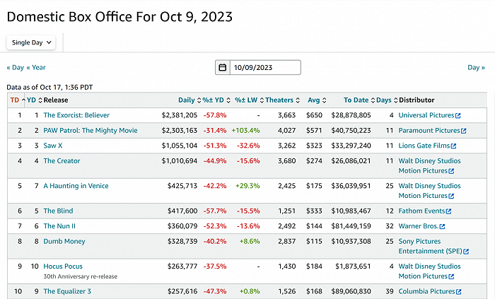 来到星期一,适逢“原住民日”(即原“哥伦布日”),《驱魔人:信徒》较周日下跌近58%至238万美元,以不到8万美元的微弱优势留在榜首。而倾向家庭客流的影片则明显受益,《汪汪队立大功大电影2:超能大冒险》、《蓝甲虫》、《忍者神龟:变种大乱斗》和《芭比》都同比提升逾三成。