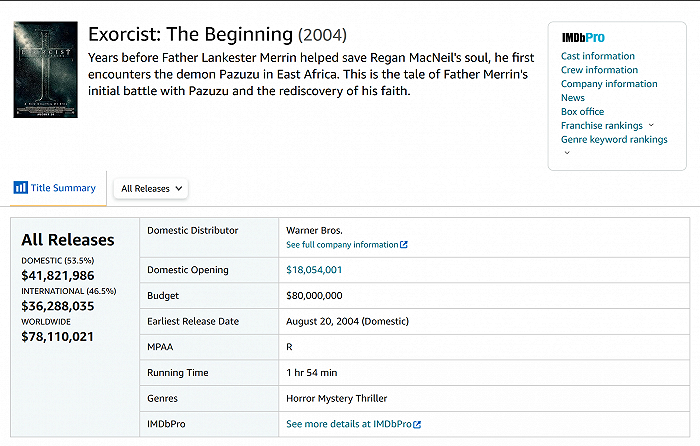 进入新世纪,好莱坞片商对这一恐怖片经典仍心存希冀,但调整了《驱魔人》系列的开发方向。2004年8月,由雷尼·哈林导演的《驱魔人前传》在暑期档末段登场,本土票房达到4182万美元,超过除原版外的其他作品。相隔仅9个月,华纳兄弟又推出另一部由保罗·施拉德执导的《驱魔人前传》,于2005年春季在家庭录像渠道发行,5月份则在院线产出约25万美元。