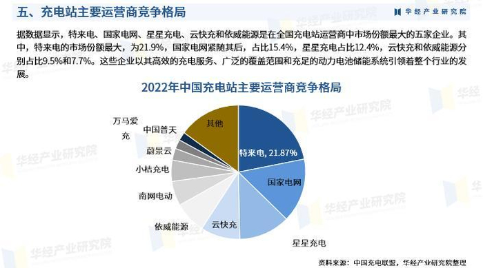 据数据显示,特来电、国家电网、星星充电、云快充和依威能源是在全国充电站运营商中市场份额最大的五家企业。其中,特来电的市场份额最大,为21.9%,国家电网紧随其后,占比15.4%,星星充电占比12.4%,云快充和依威能源分别占比9.5%和7.7%。这些企业以其高效的充电服务、广泛的覆盖范围和充足的动力电池储能系统引领着整个行业的发展。