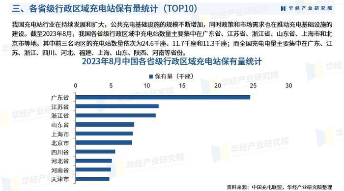 我国充电站行业在持续发展和扩大,公共充电基础设施的规模不断增加,同时政策和市场需求也在推动充电基础设施的建设。截至2023年8月,我国各省级行政区域中充电站数量主要集中在广东省、江苏省、浙江省、山东省、上海市和北京市等地,其中前三名地区的充电站数量依次为24.6千座、11.7千座和11.3千座;而全国充电电量主要集中在广东、江苏、浙江、四川、河北、福建、上海、山东、陕西、河南等省份。