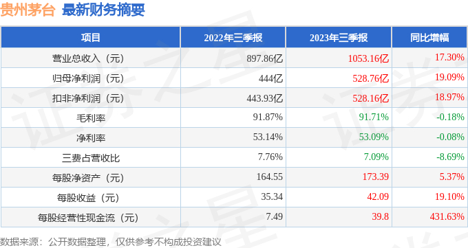 贵州茅台(600519)2023年三季报简析:营收净利润双双增长