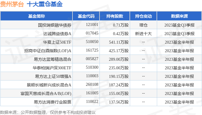 持有贵州茅台最多的基金为国投瑞银融华债券,目前规模为10.62亿元,最新净值1.5026(10月20日),较上一交易日下跌0.1%,近一年上涨4.44%。该基金现任基金经理为杨枫。