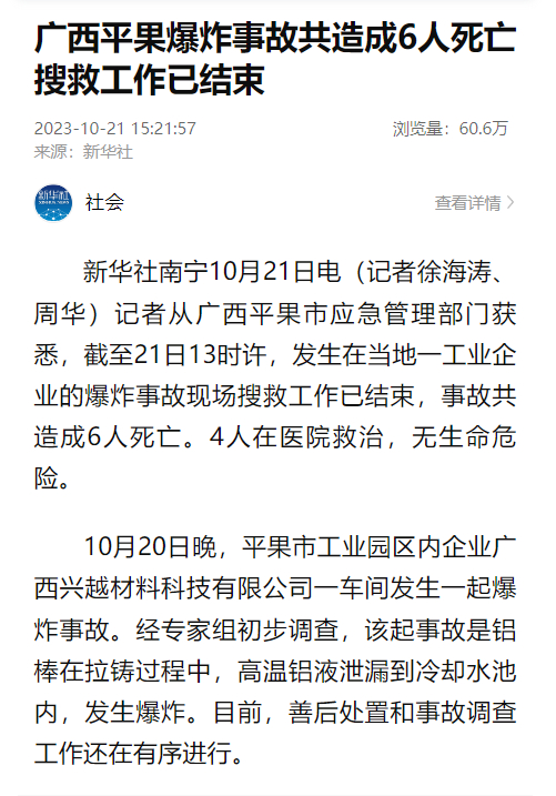 截至10月21日13时许,发生在广西平果市一工业企业的爆炸事故现场搜救工作已结束,事故共造成6人死亡。4人在医院救治,无生命危险。