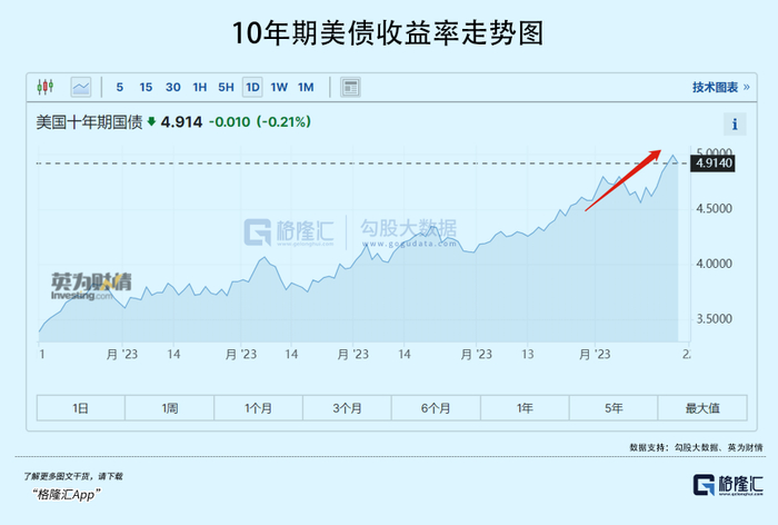 10月19日,10年期美债收益率一度突破5%大关,较10月11日大幅飙升逾40个基点,斜率非常之陡峭。