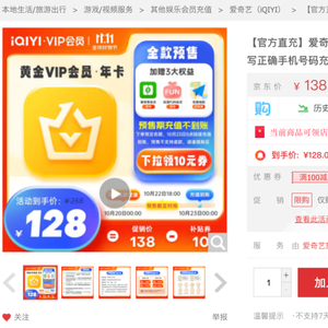 如上图所见,爱奇艺VIP会员黄金年卡(12个月)券后128元(指路京东🔍爱奇艺旗舰店,商品详情页领券即可)