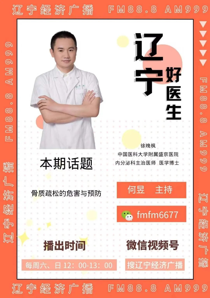 2023年10月22日(周日)中午12:00,FM88.8辽宁广播电视台经济广播《辽宁好医生》节目将邀请:中国医科大学附属盛京医院内分泌科主治医师,医学博士徐晚枫医生走进直播间,和您聊聊:不要忽视骨质疏松的预防与治疗!欢迎收听、收看。