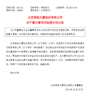 10月19日盘后,翠微股份(603123.SH)发布《关于重大事项风险提示性公告》,称控股子公司海科融通在收单业务中存在部分标准类商户交易使用优惠类商户交易费率上送清算网络的情形。本次事项将对公司2023年第三季度及全年业绩产生重大影响,预计影响损益约-4亿元。