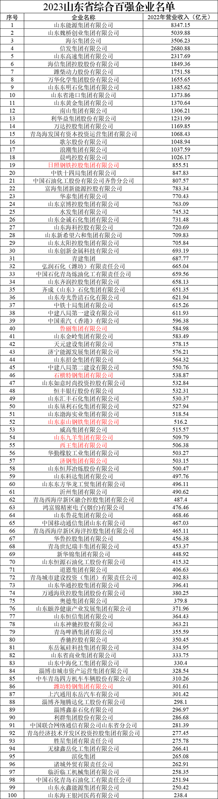 在2022年山东省综合百强企业名单中,山东钢铁集团有限公司以2665.19亿元位居全榜单第五名,一年间,山钢集团竟已“退出”100强。