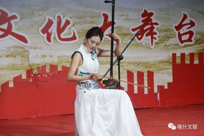 广东省文联文艺志愿者走进莎车县开展惠民文艺演出活动中,省级非遗单弦拉戏传承人顾丽敏单弦演奏《我爱你中国》。