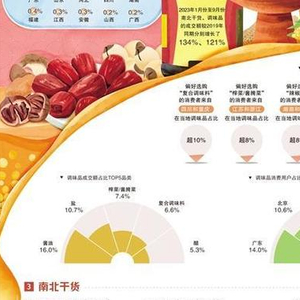 在调味品消费方面,消费者的选择更加多样化。不同地区消费者对调味品有不同偏好,如四川、重庆的消费者更倾向选购复合调味料,江苏和浙江消费者对榨菜/酱腌菜更有兴趣,而北京、天津消费者更关注香辛料。从消费数据来看,酱油、盐、榨菜/酱腌菜、复合调味料、醋等产品成交额占比较高,果酱、豆豉等产品的成交额增速在10倍以上。