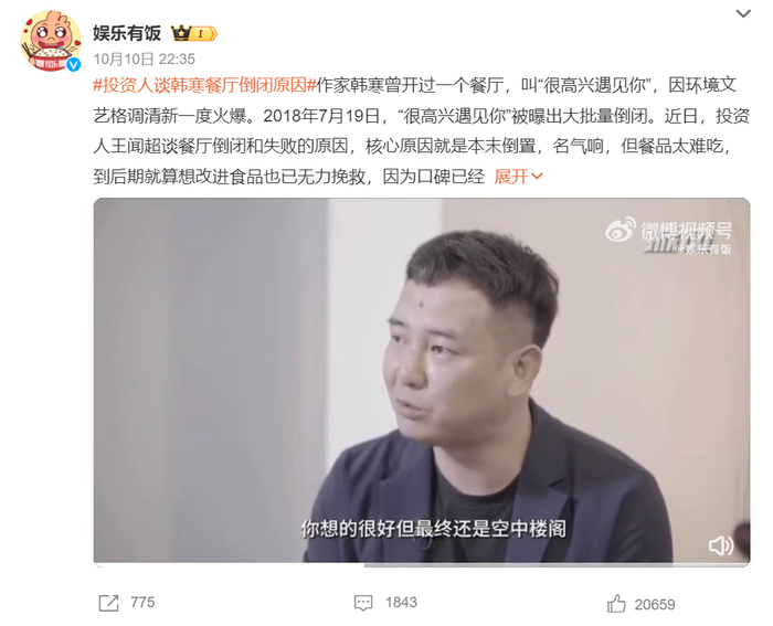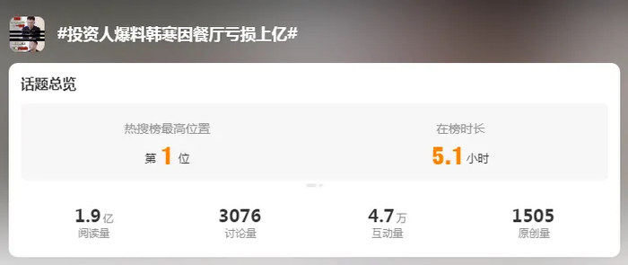 10月11日,#投资人爆料韩寒因餐厅亏损上亿# 冲上热搜。