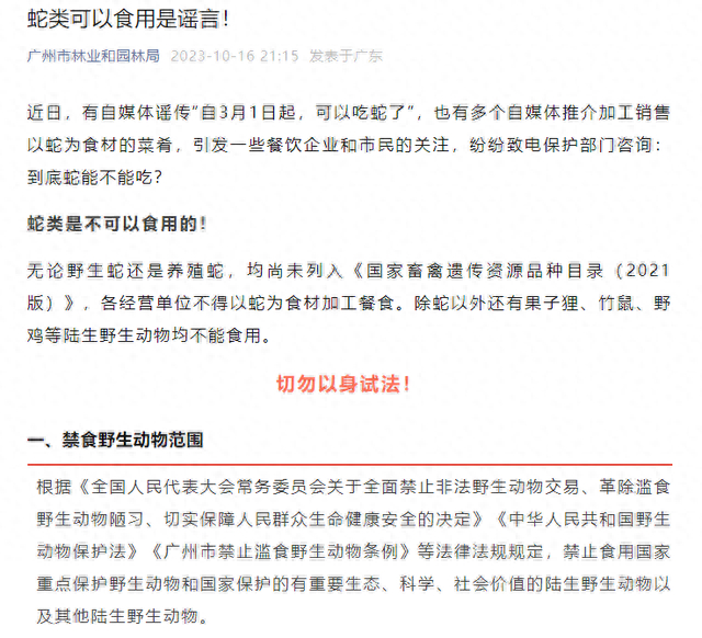 民间有说法认为,秋季的蛇肉更加鲜嫩,有助于增强体力与免疫力。然而,广州市林业和园林局近日发表《蛇类可以食用是谣言!》一文,回应称: