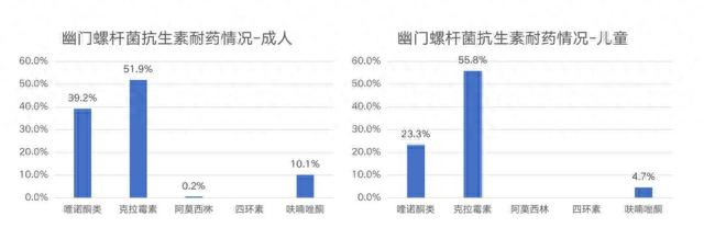 “耐药地图”显示,成人和儿童对克拉霉素的耐药率均超过50%,其中成人对克拉霉素的耐药率为51.9%,儿童对克拉霉素的耐药率为55.8%。该结果明显高于目前文献报道的耐药情况,据《中国幽门螺杆菌原发性抗生素耐药性的系统回顾和荟萃分析》中显示,克拉霉素的耐药率在2016至2020年达到34%。