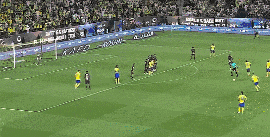 直到第52分钟,利雅得胜利才利用禁区前沿的直接任意球机会把比分扳平,塔利斯卡左脚操刀主罚绕过人墙钻入球门左下角。第56分钟,利雅得胜利再次获得前场任意球机会。C罗善于用右脚,塔利斯卡善于用左脚,两位任意球专家再次一起站在球前,颇具迷惑性。