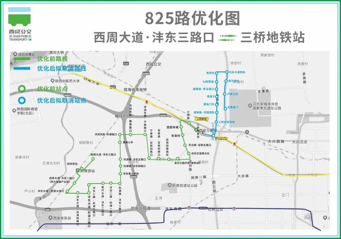 调整后:线路由“西周大道·沣东三路口”始发,沿西周大道、沣东二路、沣兴路、文宣二路、西周大道、沣东大道、科源三路、沣东二路、科源路、征和六路、宁泰路、征和四路、天台路、三桥新街行驶至“三桥地铁站”。