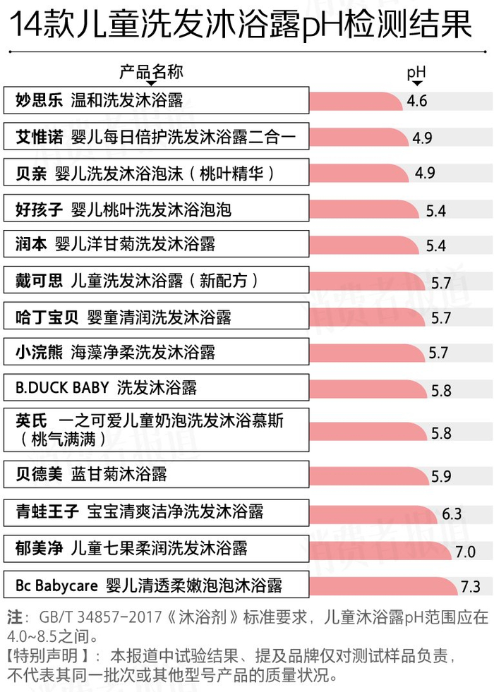 14款儿童洗发沐浴露pH测试结果显示,大部分产品pH呈弱酸性,范围在4.6~6.3之间,郁美净、Bc Babycare两款的pH分别为7.0、7.3,呈中性。