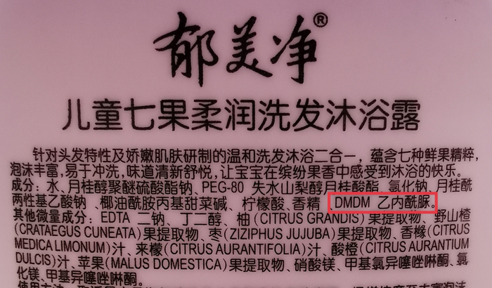 观察郁美净儿童七果柔润洗发沐浴露外包装,其成分标签标示含有DMDM 乙内酰脲,因此会释放出甲醛。