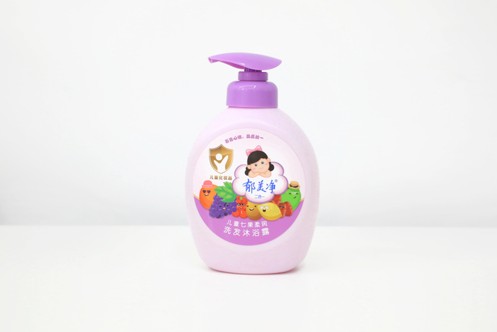 郁美净儿童七果柔润洗发沐浴露样品标签信息实拍(显示含有DMDM 乙内酰脲)