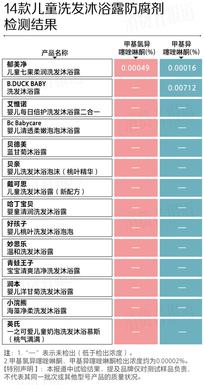 2. B.DUCK BABY、郁美净两款产品检出异噻唑啉酮类防腐剂。