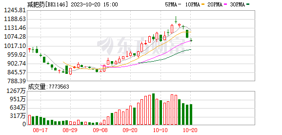 近期,减肥药板块部分上市公司因为蹭热点而公开道歉,火了一个多月的减肥药市场也有所降温。截至10月20日收盘,减肥药板块下跌1.97%。个股方面,双鹭药业昊帆生物双双跌停,多数个股下跌。唯有翰宇药业德展健康两只个股仍处于上涨态势,其中,翰宇药业股价大涨超15%。
