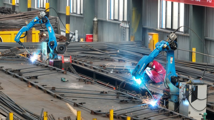 在武重高速汉川段二标段钢筋加工场,机器人挥舞手臂不停地焊接钢筋,生产平台上,数控钢筋笼滚焊机正在切割,整个车间仅需几个工人辅助作业。在智慧梁场,下料、绑扎、焊接、制模、浇筑、蒸养等工序都由电脑控制,工作人员在中控室一键操作完成。此外,预制梁浇筑完成后自动进入“桑拿房”进行蒸养,全程只需几个人。