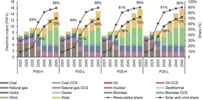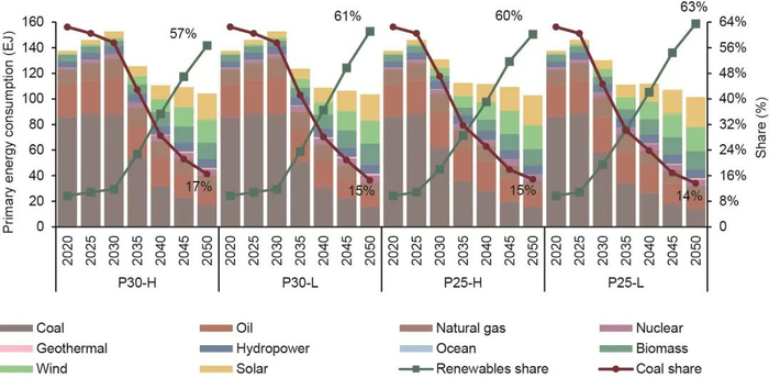 相比之下,可再生能源目前占一次能源消费的10%,同时增长缓慢,主要是为了满足增量能源需求。未来,可再生能源将最有希望填补由煤炭消费下降造成的缺口,从而逐步取代化石燃料。据测算,在2035—2040年,可再生能源将超越化石燃料,成为中国最主要的能源。到2050年,中国一次能源消费中可再生能源比重将达到约60%。同样,对于2050年碳预算较低或者开始减排较早的情景(P25-L、P25-H和P30-L),可再生能源的占比将更高。