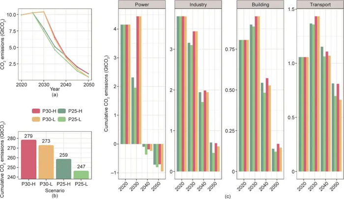 图2. (a)能源系统减排路径;(b)2011—2050年累计碳排放;(c)分部门碳排放情况。