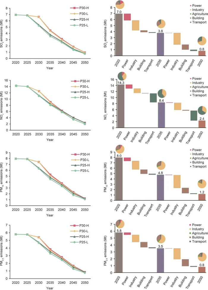图10. CO2减排对局地空气污染物治理的协同效应(左)和P25-H情景下,2020—2035年和2035—2050年两段时期,各部门对于局地空气污染物减排的贡献分解(右)。