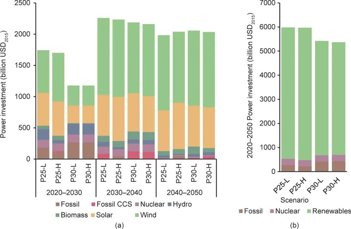 图9. 电力部门不同技术投资(a)和2020—2050年电力部门总投资(b)。USD2015表示采用2015年美元不变价,并且按照2015年官方公布的汇率将人民币转换为美元进行统计。