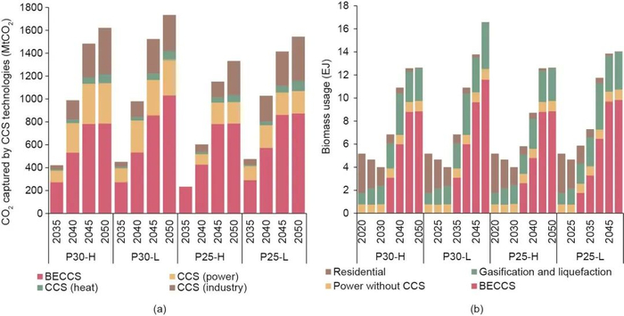 图7. 不同CCS技术的二氧化碳捕集量(a)和生物质使用量(b)。