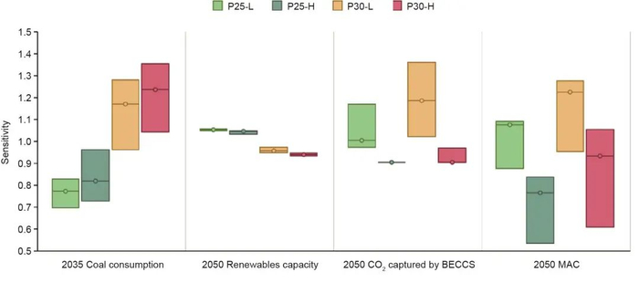 图11. 2035年煤炭消费、2050年可再生能源装机容量、2050年BECCS产生的负排放和2050年边际减排成本的灵敏性分析。在固定峰值水平、达峰时间和2050年排放水平的情况下,2011—2050年每个灵敏性情景下累计排放增加或减少5%。根据基础情景的平均值对结果进行归一化处理。箱型图中的空心点代表了基础情景下的数值。
