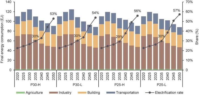需求部门的快速减排要迟于电力部门,2050年的排放约束对转型路径的影响要比达峰时间更大。目前工业部门排放约40亿吨,预计已经达峰,并开始稳步下降。到2050年,工业部门排放不足7亿吨,减排80%。交通部门和建筑部门,峰值分别在14亿吨和10亿吨以内。更早采取减排行动,能够明显降低建筑部门和交通部门的碳排放峰值水平。到2050年,建筑部门排放仅有1亿~2亿吨,交通部门则仍有7亿~8亿吨。对于2050年碳排放约束更严格的情景(P25-L和P30-L),需求部门,尤其是交通部门需要做出更大幅度的减排。