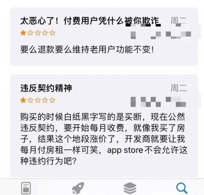 例如Notability这个笔记软件,前期推出买断价格60元,促销活动时价格一度低于25元,却在2021年Notability宣布由买断制转变为订阅制,转变后,老用户享有一年免费权益,一年之后需要通过付费订阅解锁核心功能,该行为被老用户骂上热搜,遭到热度的反噬。