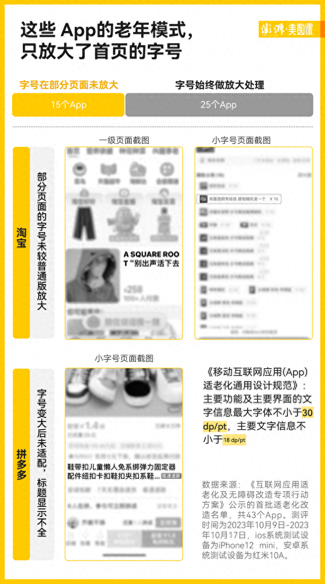 例如淘宝 App 的老年模式,首页很贴心地放了语音搜索,商品的名称、介绍也都放大了字号,可一到点开选款式时,字就缩得小小的、密密麻麻挤在一起。拼多多在老年模式上,也有一些适配不够友好的问题——标题写不下的大字全都收进了末尾的省略号中,无论怎么点击,都展不开、看不全。