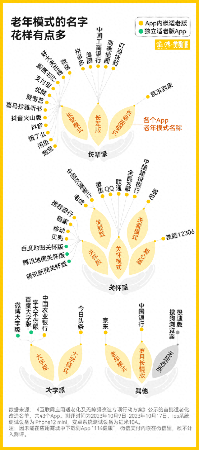 首先,不同 App 的老年模式的名字就很不一样。有的叫关怀,有的讲关爱,有的打造为“长辈版”,还有的将适老版叫作“大字版”。最别出心裁的是 “中国银行”的 App,老年模式被命名为“岁月长情版”。