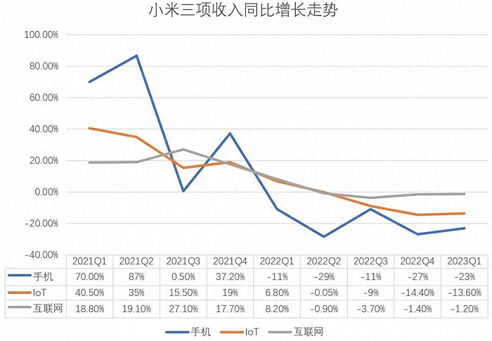 最初,MIUI、手机、米聊构成了小米的“三驾马车”,随着小米集团的转型,“三驾马车”也随之调整至目前的手机、AIoT、互联网,到了最近三年,智能汽车又占到了极高的权重。