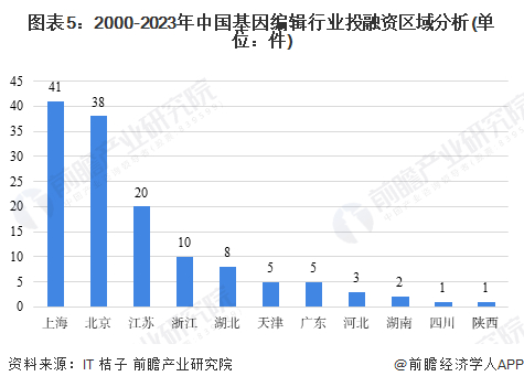 从基因编辑投融资项目的分布区域来看,截至2023年,发生在上海的项目数量最多,达到了41件,其次为北京,为38件。这两大地区的投融资事件数量遥遥领先于其他地区,排名第三的江苏省投融资事件数量仅为20件,其余省份未超过10件。结合当地的资源特色,可以看出,基因编辑行业的发展对于科研资源、经济资源的要求较高。
