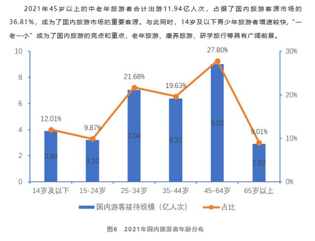 和王大爷一样的中老年人,已经成为旅游市场的第一大客源。中国旅游研究院的报告显示,2021年45岁—64岁人群出游9.02亿次,占比27.80%,成为旅游市场第一大客源。携程数据显示,截至10月15日,今年以来,55岁以上人群出游数量同比去年同期增长近2倍。从具体年龄段看,55岁-60岁年龄段是主力消费人群,出游人数占比最高,达到6成;61-65岁占比超2成。