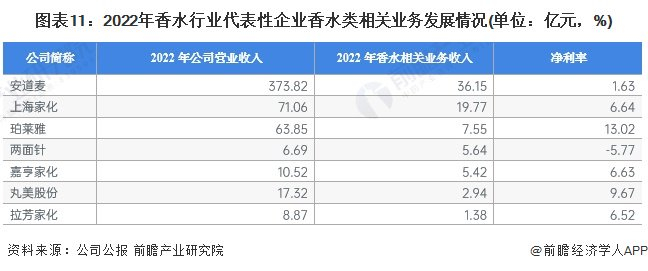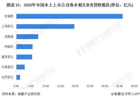 按香水相关业务营收金额来看,2022年,安道麦以36.15亿元的业务收入位列第一,上海家化业务收入19.77亿元,位列第二;珀莱雅、两面针和嘉亨家化业务收入分别位列第三、第四和第五,其余两家企业业务收入不足3亿元。