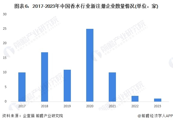 以“香水”关键词于企查猫官网搜索,可知,2017-2023年中国香水行业企业(包含了销售企业和代理商)新注册数量整体呈波动趋势,2020年新注册成立25家香水企业,为近几年顶峰。2023年1月至9月,中国香水行业新注册企业数量仅1家。