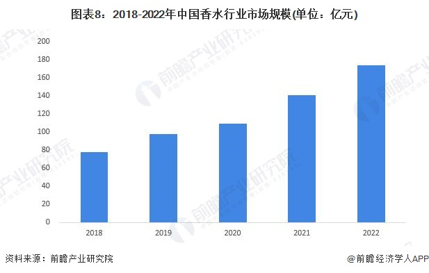 2011-2016年,由于使用香水在国内还未形成普遍的消费习惯,故市场规模相比其他日化类较低。但是,2016年后,随着中产阶级人口逐渐增多,香水产品作为能够衬托出生活品质的产品,香水市场销售量呈现爆发式上涨。与此同时,在个性化的当下,气味个性化成为了消费者展现自我的一种表达方式,对香水的需求也逐渐增多。根据公开数据初步核算2022年我国香水市场规模超174亿元,同比增长23.68%。