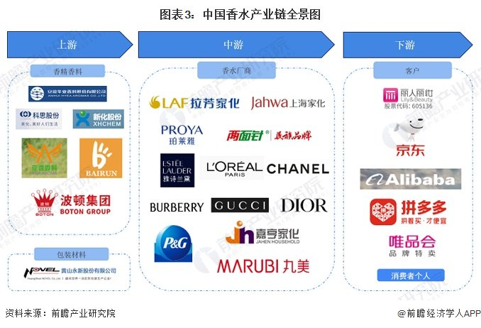 香水产业链上游企业有华业香料、科思股份、新化股份、亚香股份、百润股份等香精香料厂商以及永新股份等包装材料公司;中游企业有雅诗兰黛、GUCCI、DIOR、BURBERRY等国外香水品牌厂商以及上海家化、珀莱雅等本土香水品牌厂商;行业下游为丽人丽妆、京东、阿里巴巴、拼多多、唯品会等电商平台以及线下商超、消费者个人。