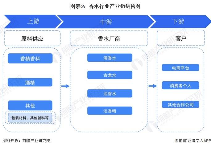 中国香水产业链上游主要包括香精香料厂商、包装材料厂商以及其他辅料厂商等;产业链中游主要是各类香水生产企业;下游主要为电商平台、线下商超等销售渠道运营商、消费者个人以及其他合作公司。