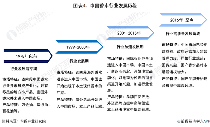 在中国,在中国,香水属于舶来品,直至20世纪90年代,国外香水在国内开始流行,香水的理念逐步被国人接受。纵观中国现代香水产业发展历史,其发展历程主要可以划分为4个阶段,包括178年以前的行业发展萌芽期、1979-2000年的行业发展期、2001-2015年的行业加速发展期以及2016-至今的行业高质量发展阶段。每个阶段的具体特征如下: