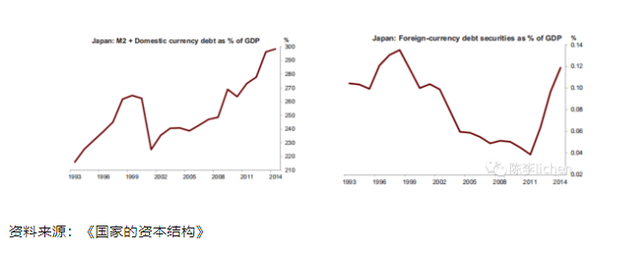 以日本为例,日本在1993-2014年期间的债务、政策、经济表现,本币主权债务上升。尽管日本从1993年把国家资产负债率从200%提高到2014年的300%,但其中外债占GDP比例从来没有超过0.15%,不足千分之二。所以日本从来没有出现过国家债务危机。