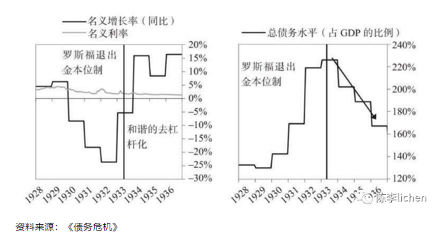 达利欧在书中,对比了一战后德国债务危机和美国大萧条时期债务危机,来说明债务主要是外币(一战后的德国),其情况糟糕程度和解决难度,要明显大于本币债务(脱离了金本位后的大萧条后期美国)。