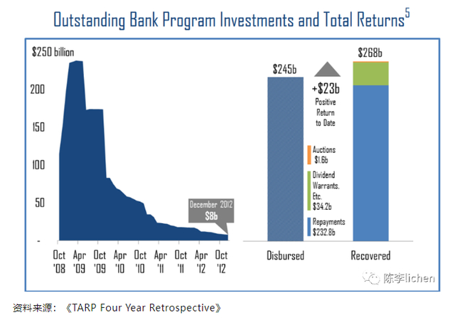 TARP分为5个项目,其中用于稳定银行的Bank Investment Programs实际花费为2450亿美元,通过还款、股息、利息和其他收入等,3年内就回本了。(2011年3月16日,财政部宣称,用于稳定银行的2450亿美元已收回了99%+。)截至2012年末,注入银行的部分,甚至获得230亿美元的正回报。