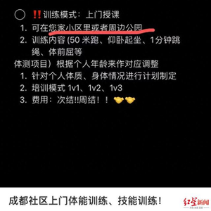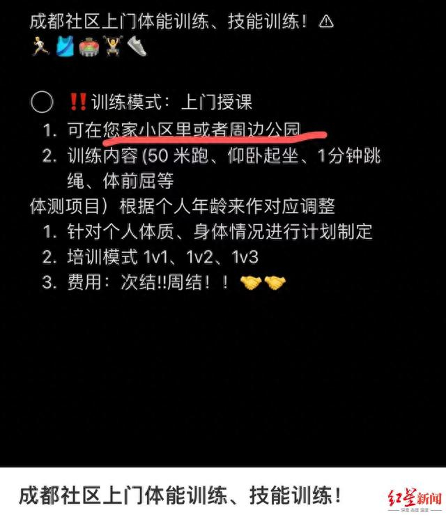 红星新闻记者在小红书等社交平台上搜索发现,成都真有不少机构或教练推出上门体育服务,培训项目多样,甚至还有人专门上门教跳绳。经查询,这类“上门体育课”出现在成都大概至少也有半年了——所谓上门体育培训,顾名思义,就是老师上门给孩子上体育课。
